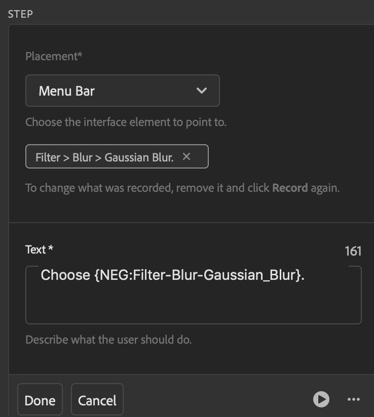 - Scroll down and click the Done button to close the editing area. The coach mark text appears in a blue box in the Tutorial Builder.