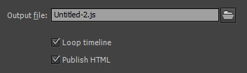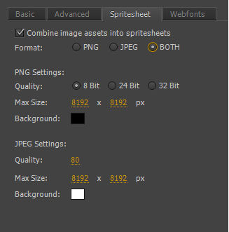 Exporting a number of bitmaps that you have used in your HTML5 Canvas document as a single sprite sheet reduces the number of server requests, reduces the output size, and improves performance. You can export spritesheet either as PNG (default), JPEG, or both.
