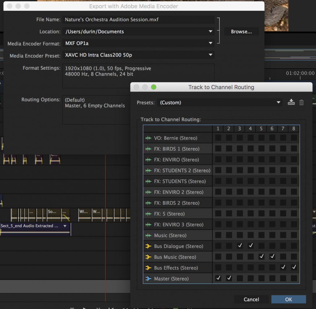In this case, you have your standard audio tracks, each of them routed through a separate Dialogue, Music, and FX bus. This not only allows you to toggle specific elements of your production on and off while working, but you can assign the output of each bus to various channels in the AME export. Why does this matter? Because many broadcast organizations use formats like MXF for more than just playing back videos. You may work with different language tracks, such as Spanish or French, in addition to the sound effects, music, and full English mixdown audio, and the playback systems know which channels to stream for which broadcast destination.