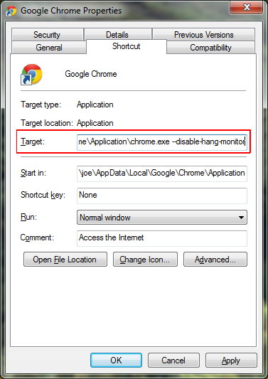 --disable-hang-monitorNote: When you append the value in the Target field, ensure that you add a space between chrome.exe and --disable-hang-monitor as follows: